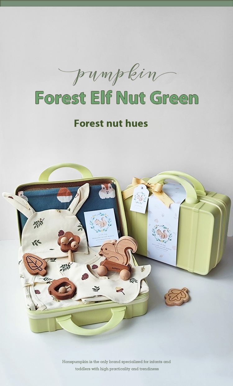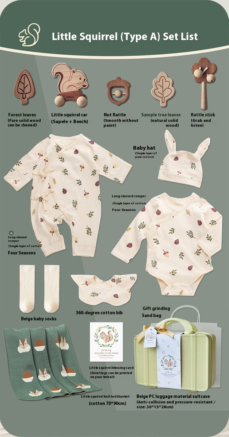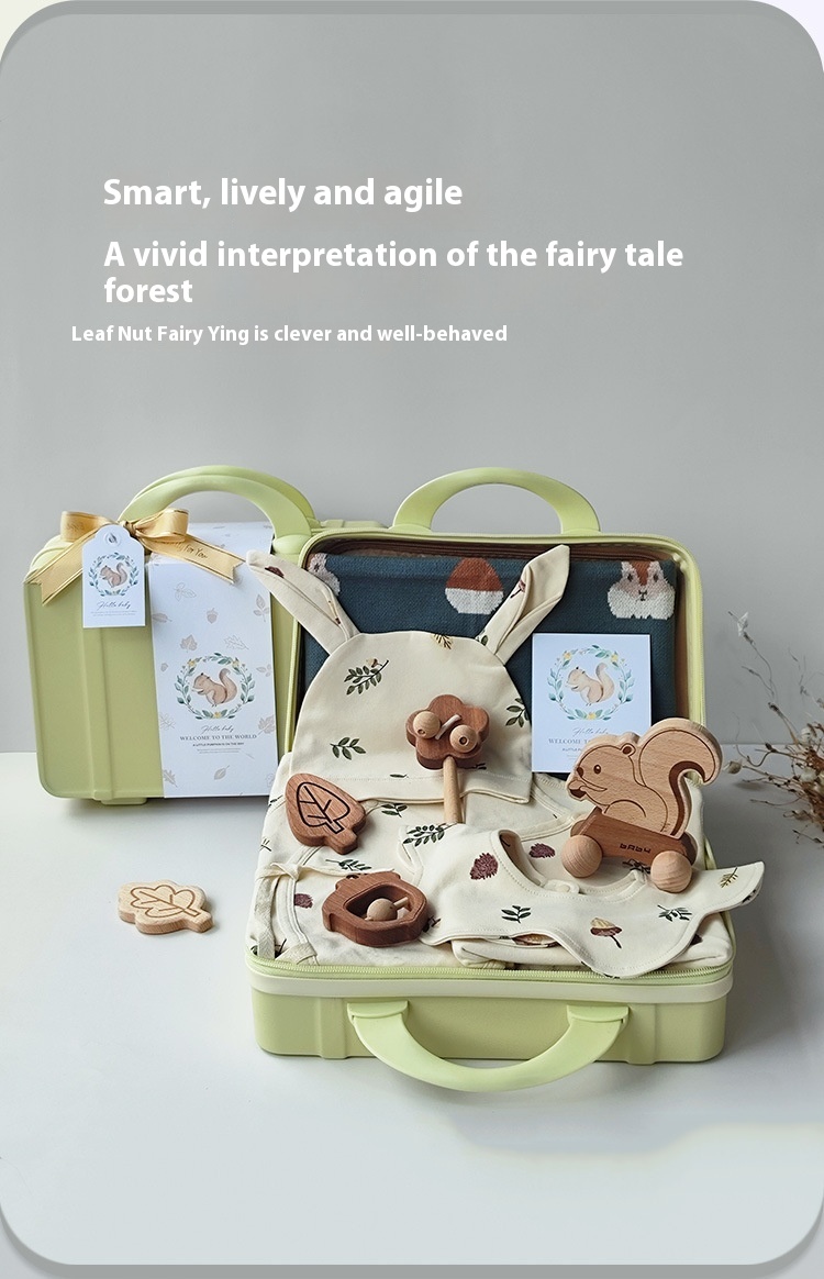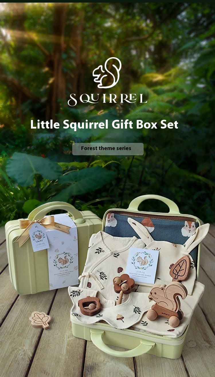 Delight new parents with this adorable squirrel-themed baby gift set, thoughtfully designed with soft cotton clothing and eco-friendly wooden toys. Beautifully packaged in a keepsake suitcase, this set is perfect for newborns up to 6 months, making it an ideal baby shower, birthday, or welcome-home gift.