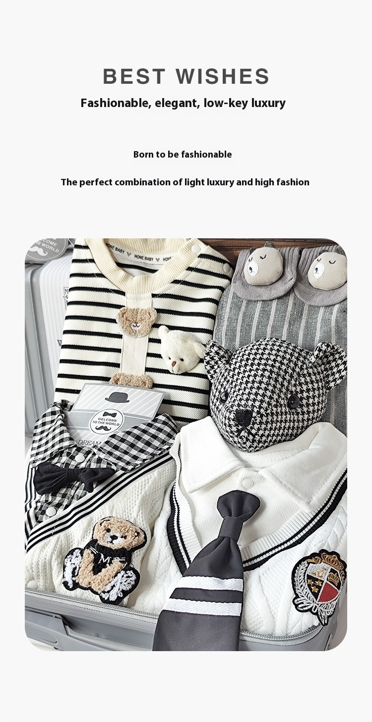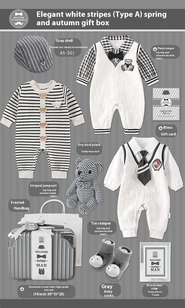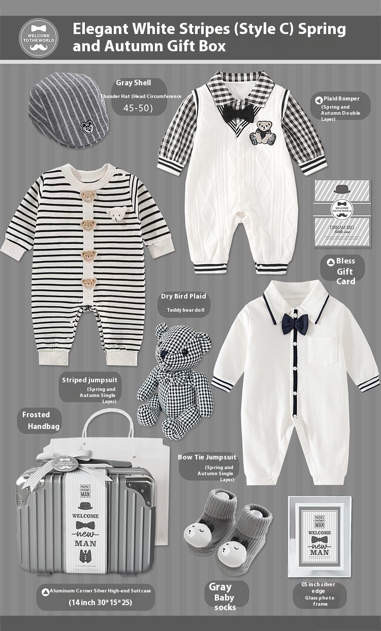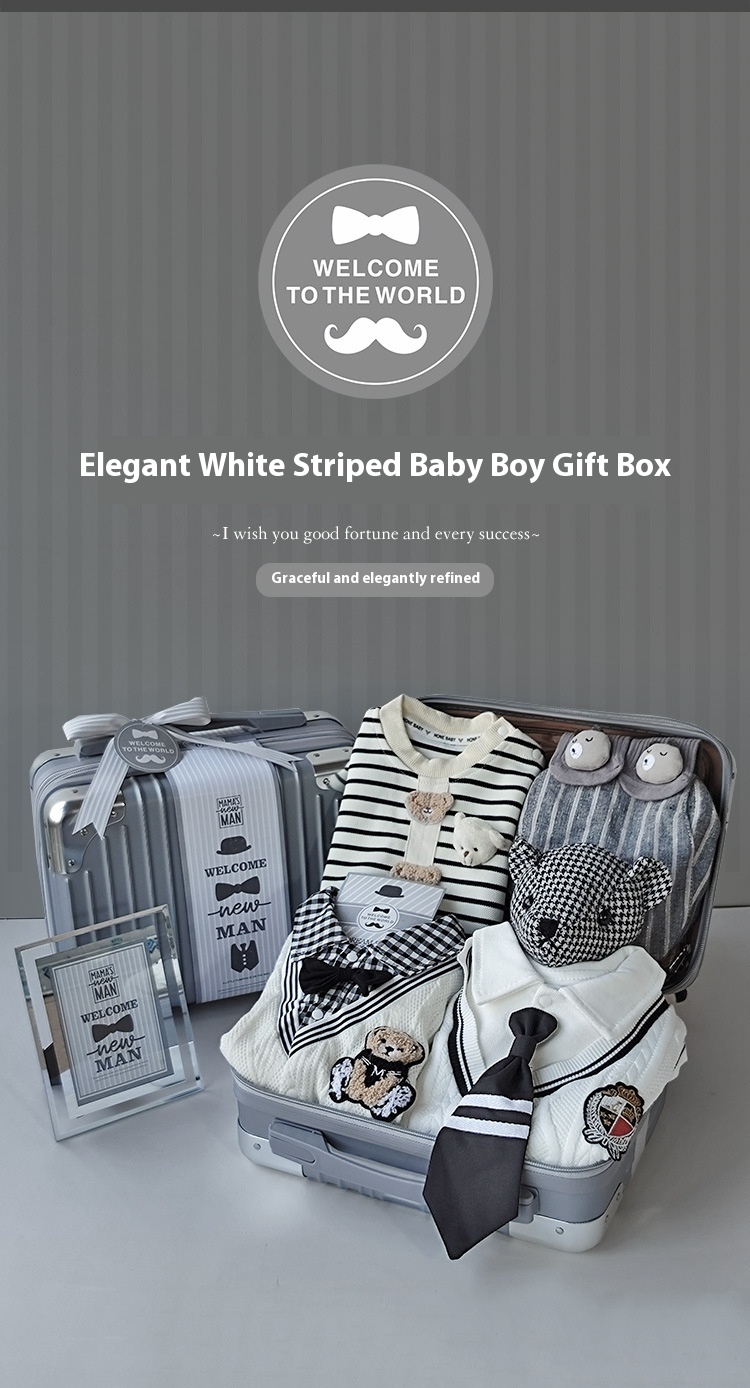 Welcome a little one in style with this elegant striped baby gift set, beautifully packaged in a modern suitcase gift box. Featuring soft cotton clothing, adorable accessories, and a keepsake photo frame, this set makes the perfect present for baby showers, birthdays, or newborn celebrations.