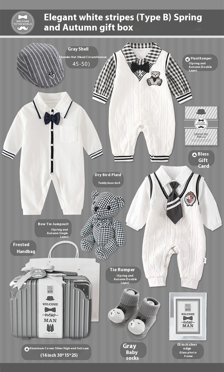 Complete 9-piece gift set: Includes rompers, hat, socks, doll, photo frame, and more.